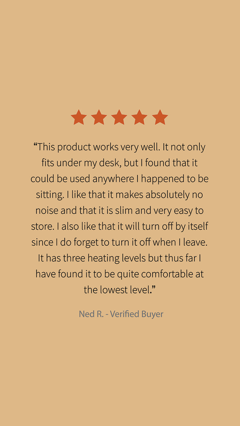 The Whisper Heat foldable heater has received high customer ratings and positive reviews. Customers enjoy the convenience, safety and silence and comfort of keeping their feet warm with Whisper Heat.