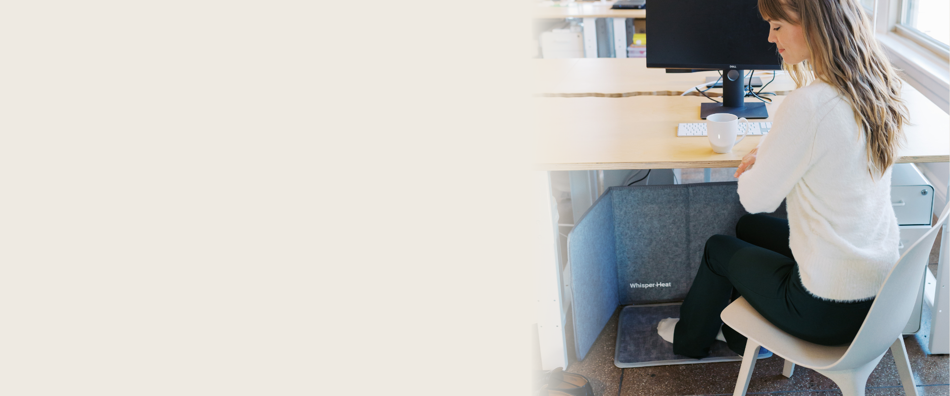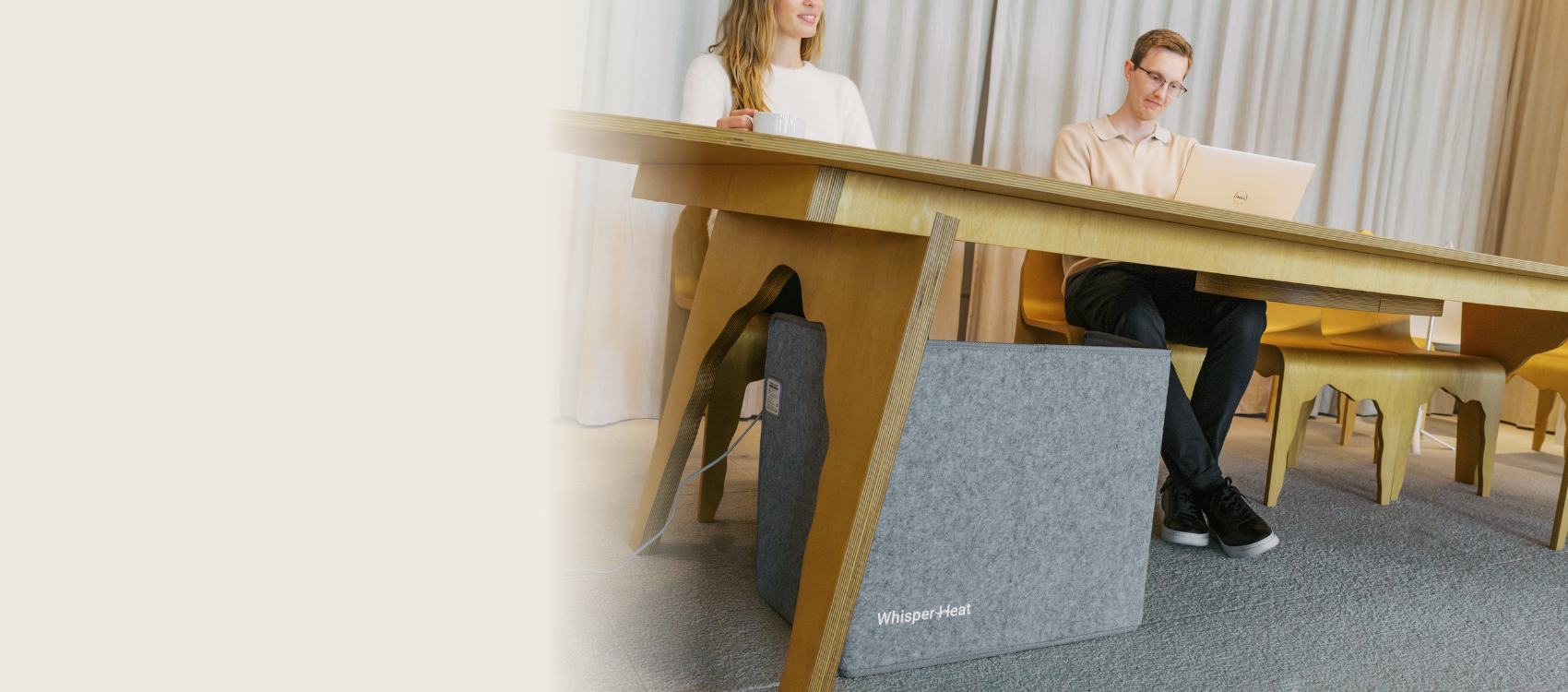 Welcome to WHISPER HEAT, a new way to keep your feet warm under your desk. At home or the office, you will have a comfortable warm zone, just where you need it. The Whisper Heater is safe, silent and effective anywhere your feet get cold.