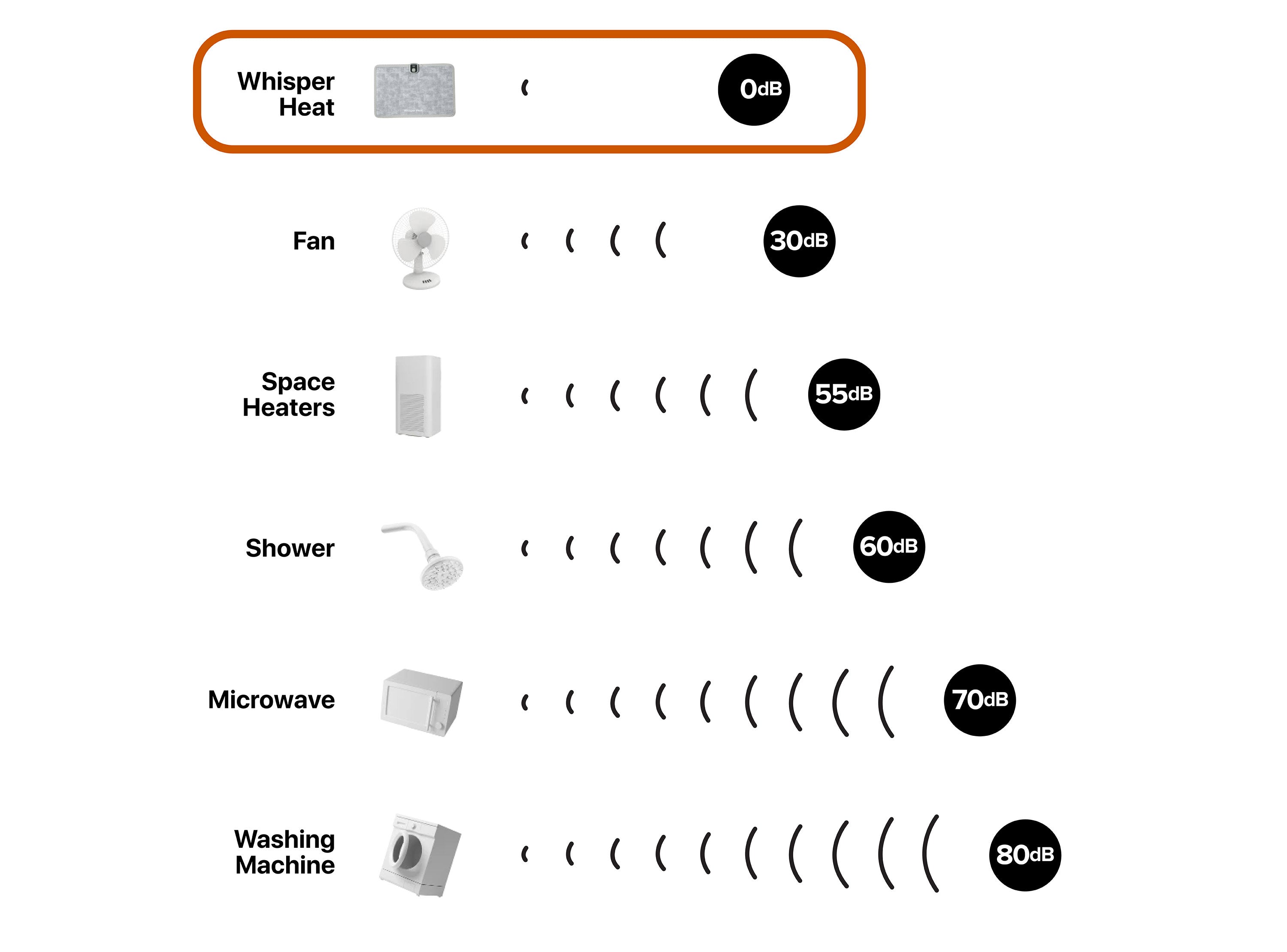 At just 0dB, Whisper Heat is the most silent heater ever. We call it Meditation Quiet.