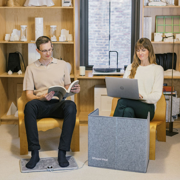 The Whisper Heat Complete Set pairs the Under Desk Heater with the Heated Floor Mat to deliver powerful foot and leg warmth.